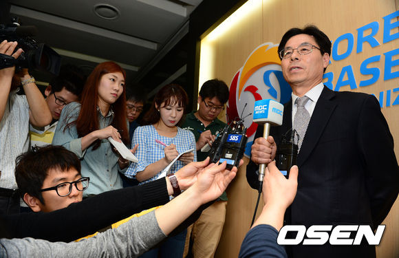 KBO의 발표 후 창원시 새야구장건립사업단 이용암 단장이 기자회견을 하고 있다. 이용암 단장은 KBO의 주장을 반박하며 확정된 입지를 바꾸는것은 있을 수 없는 일이라고 했다.