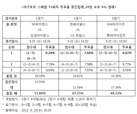 [야구토토] 국민체육진흥공단(www.kspo.or.kr)이 발행하는 체육진흥투표권 수탁사업자인 스포츠토토의 공식 온라인 발매 사이트 베트맨(www.betman.co.kr)이 오는 25일에 열리는 한국프로야구(KBO) 3경기를 대상으로 한 야구토토 스페셜 53회차 투표율을 중간 집계한 결과, 참가자의 67.25%는 한화-LG(2경기)전에서 LG의 승리를 예상했다.