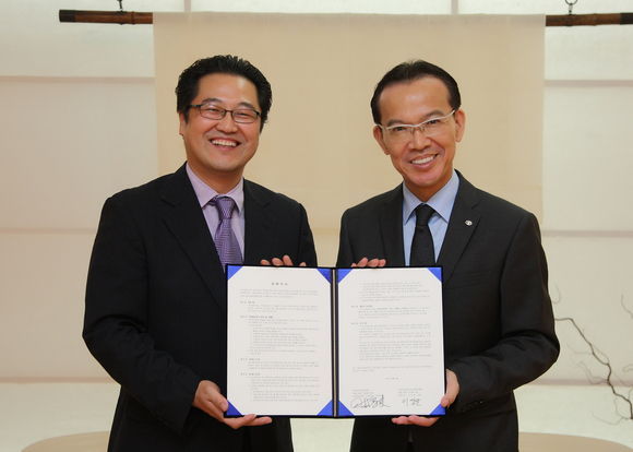 이상균 KCDF 본부장(왼쪽)과 나카바야시 히사오 한국토요타자동차 사장./ 한국토요타자동차 제공.