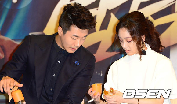 배우 권상우와 정려원이 음료를 마시기 전 이야기를 나누고 있다.