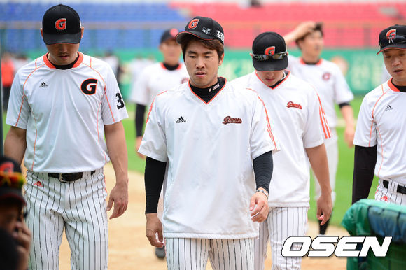 24일 오후 광주 무등구장에서 열리는 '2013 한국야쿠르트 세븐 프로야구' KIA 타이거즈와 롯데 자이언츠의 경기 시작전 전준우가 외야에서 몸을 풀고 덕아웃으로 들어오고 있다.