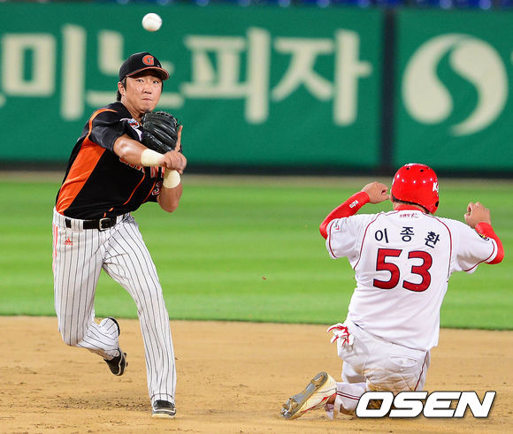 24일 오후 광주 무등구장에서 열린 '2013 한국야쿠르트 세븐 프로야구' KIA 타이거즈와 롯데 자이언츠의 경기 2회말 무사 1루 백용환의 병살타를 정훈이 2루에서 이종환을 포스아웃 시킨 후 1루로 송구하고 있다.