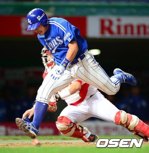 30일 오후 인천 문학야구장에서 열린 2013 한국야쿠르트 세븐프로야구 SK 와이번스와 삼성 라이온즈의 경기, 2회초 2사 2,3루에서 삼성 정형식의 선제 2타점 중전안타에 2루주자 이정식이 홈을 밟고 있다.