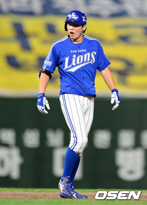 30일 오후 인천 문학야구장에서 열린 2013 한국야쿠르트 세븐프로야구 SK 와이번스와 삼성 라이온즈의 경기, 2회초 2사 2,3루에서 삼성 정형식이 선제 2타점 중전안타를 날리고 기뻐하고 있다.