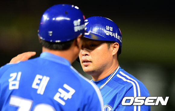 30일 오후 인천 문학야구장에서 열린 2013 한국야쿠르트 세븐프로야구 SK 와이번스와 삼성 라이온즈의 경기, 2회초 2사 2루에서 삼성 박한이가 1타점 적시타를 날리고 김태균 코치와 하이파이브를 하고 있다.