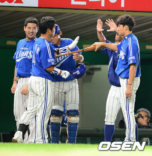 30일 오후 인천 문학야구장에서 열린 2013 한국야쿠르트 세븐프로야구 SK 와이번스와 삼성 라이온즈의 경기, 6회초 무사에서 삼성 김태완이 좌월 솔로포를 날리고 더그아웃에서 동료선수들의 축하를 받고 있다.