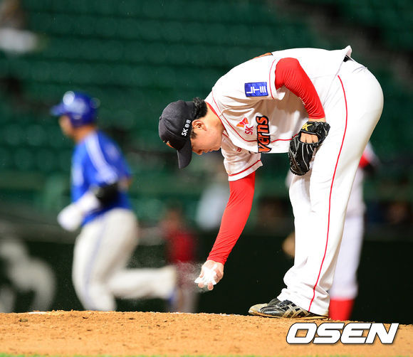 30일 오후 인천 문학야구장에서 열린 2013 한국야쿠르트 세븐프로야구 SK 와이번스와 삼성 라이온즈의 경기, 6회초 무사에서 SK 여건욱이 삼성 김태완에 좌월 솔로포를 허용하고 아쉬워하고 있다.