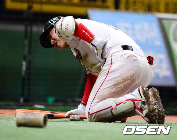 30일 오후 인천 문학야구장에서 열린 2013 한국야쿠르트 세븐프로야구 SK 와이번스와 삼성 라이온즈의 경기, 6회말 무사에서 SK 정근우가 대기타석에서 조동화의 부러진 배트를 피하며 깜짝 놀라고 있다.