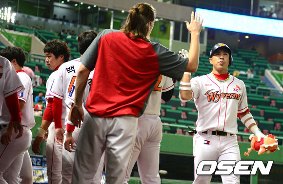 30일 오후 인천 문학야구장에서 열린 2013 한국야쿠르트 세븐프로야구 SK 와이번스와 삼성 라이온즈의 경기, 7회말 무사에서 SK 김강민이 연타석 홈런을 날리고 더그아웃에서 동료 선수들과 하이파이브를 하고 있다.