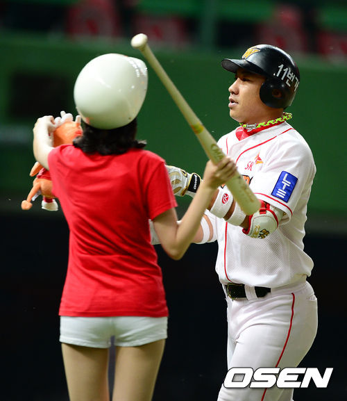 30일 오후 인천 문학야구장에서 열린 2013 한국야쿠르트 세븐프로야구 SK 와이번스와 삼성 라이온즈의 경기, 7회말 무사에서 SK 김강민이 연타석 홈런을 날리고 홈을 밟으며 배트걸의 축하를 받고 있다.