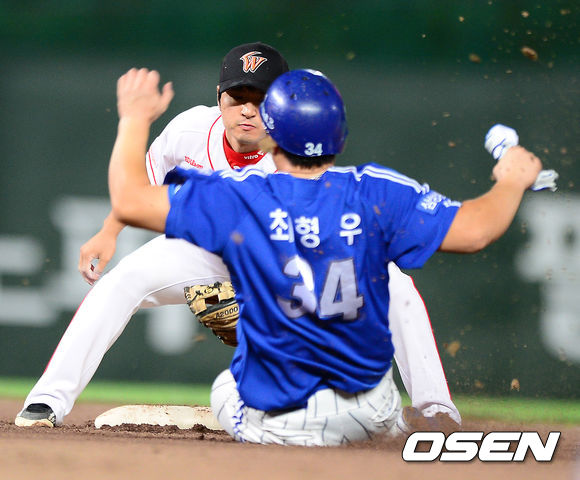 30일 오후 인천 문학야구장에서 열린 2013 한국야쿠르트 세븐프로야구 SK 와이번스와 삼성 라이온즈의 경기, 7회초 1사에서 삼성 최형우가 SK 김성현에 태그아웃당하며 2루 도루에 실패하고 있다.