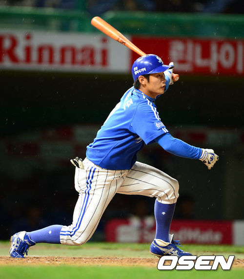 30일 오후 인천 문학야구장에서 열린 2013 한국야쿠르트 세븐프로야구 SK 와이번스와 삼성 라이온즈의 경기, 8회초 1사에서 삼성 성의준이 우중간 2루타를 날리고 타구를 바라보고 있다.