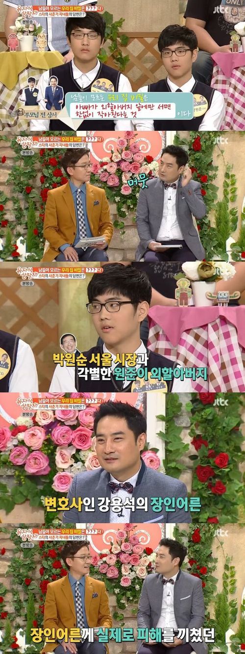 이날 강용석의 장남 강원준 군은 “남들이 모르는 우리 집 비밀은 아빠가 외할아버지 앞에만 서면 한없이 작아진다는 것이다”고 폭로, “평소에는 아빠가 자신감이 넘치는데 한창 구설수에올랐을 때 외갓집에 갔더니 기죽은 모습을 보였다”고 말했다.