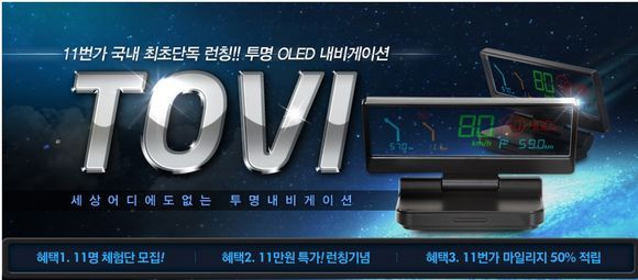 오픈마켓 11번가가 세계 최초로 출시된 투명 디스플레이 T-OLED(Transparent Organic Light Emitting Diodes)를 적용한 HUD 스마트폰 연동 내비게이션 '투비(TOVI)'를 단독 유통한다고 25일 밝혔다.