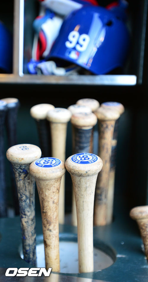 25일 (이하 한국시간) 미국 캘리포니아 샌프란시스코 AT&T 파크에서 열린 2013 메이저리그 샌프란시스코 자이언츠와 LA 다저스 경기, 경기 전 덕아웃에서 류현진의 헬멧과 배트가 놓여있다.