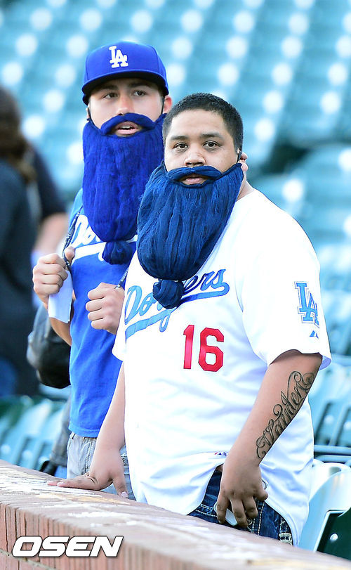 25일 (이하 한국시간) 미국 캘리포니아 샌프란시스코 AT&T 파크에서 열린 2013 메이저리그 샌프란시스코 자이언츠와 LA 다저스 경기, 경기 전 다저스 브라이언 윌슨의 팬이 수염을 달고 응원하고 있다.