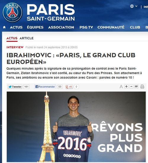 PSG는 25일(이하 한국시간) 공식 홈페이지를 통해 이브라히모비치와 재계약 사실을 알렸다. 이로써 이브라히모비치는 오는 2016년까지 계약연장에 성공했다.