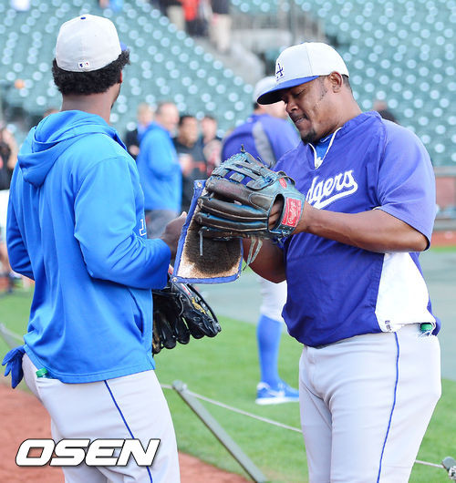 25일 (이하 한국시간) 미국 캘리포니아 샌프란시스코 AT&T 파크에서 열린 2013 메이저리그 샌프란시스코 자이언츠와 LA 다저스 경기, 경기 전 다저스 후안 유리베가 글러브에 로진을 묻히고 있다.