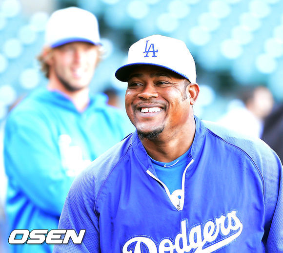 25일 (이하 한국시간) 미국 캘리포니아 샌프란시스코 AT&T 파크에서 열린 2013 메이저리그 샌프란시스코 자이언츠와 LA 다저스 경기, 경기 전 다저스 후안 유리베가 커쇼와 함께 환하게 웃고 있다.