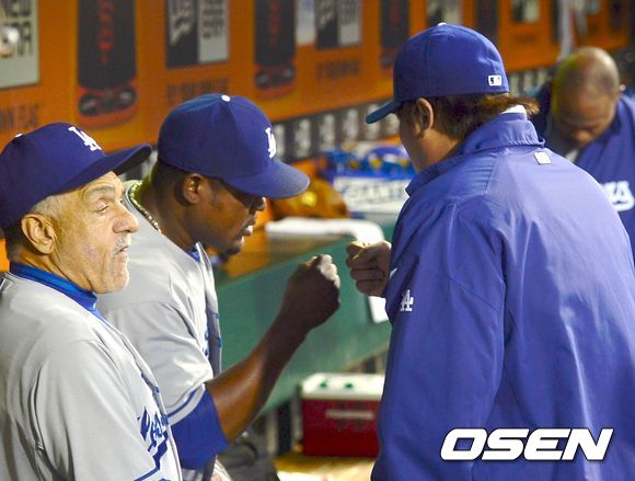 25일 (이하 한국시간) 미국 캘리포니아 샌프란시스코 AT&T 파크에서 열린 2013 메이저리그 샌프란시스코 자이언츠와 LA 다저스 경기 류현진이 유리베와 주먹을 마주치고 있다.