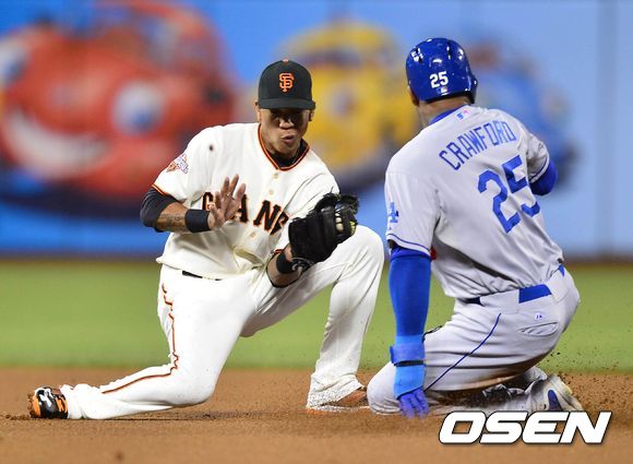 25일 (이하 한국시간) 미국 캘리포니아 샌프란시스코 AT&T 파크에서 열린 2013 메이저리그 샌프란시스코 자이언츠와 LA 다저스 경기 1회초 1사 1루 칼 크로포드가 2루 도루에 성공하고 있다.