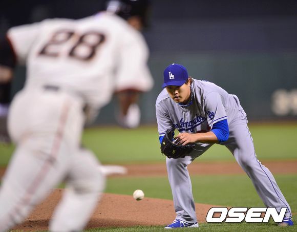 25일 (이하 한국시간) 미국 캘리포니아 샌프란시스코 AT&T 파크에서 열린 2013 메이저리그 샌프란시스코 자이언츠와 LA 다저스 경기 1회말 2사 1루 류현진이 포지를 내야땅볼로 처리하고 있다.