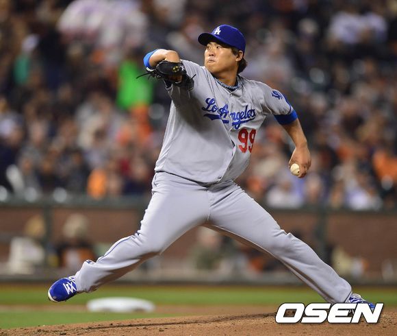 25일 (이하 한국시간) 미국 캘리포니아 샌프란시스코 AT&T 파크에서 열린 2013 메이저리그 샌프란시스코 자이언츠와 LA 다저스 경기 3회말 류현진이 힘차게 공을 던지고 있다.