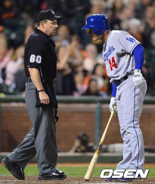 25일 (이하 한국시간) 미국 캘리포니아 샌프란시스코 AT&T 파크에서 열린 2013 메이저리그 샌프란시스코 자이언츠와 LA 다저스 경기 4회초 2사 만루 엘리스가 삼진 판정을 한 주심에 어필하고 있다.