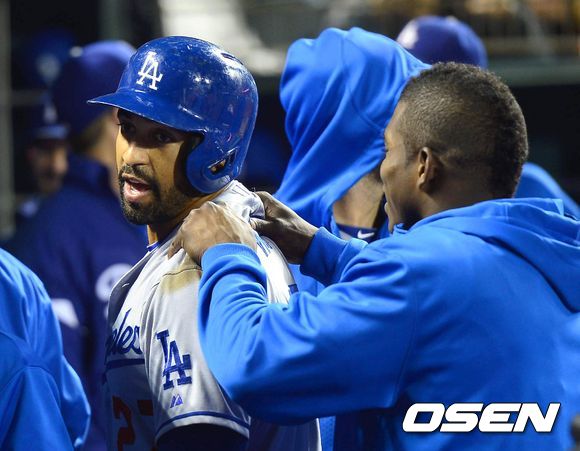 25일 (이하 한국시간) 미국 캘리포니아 샌프란시스코 AT&T 파크에서 열린 2013 메이저리그 샌프란시스코 자이언츠와 LA 다저스 경기 6회초 맷 켐프가 솔로홈런을 치고 들어오자 푸이그가 어깨를 주물러 주고 있다.