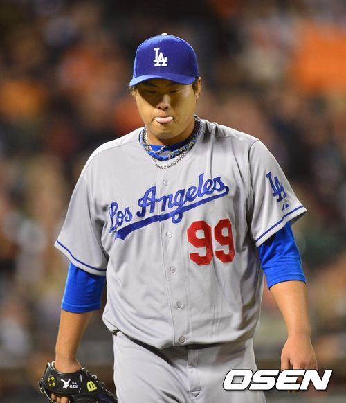 25일 (이하 한국시간) 미국 캘리포니아 샌프란시스코 AT&T 파크에서 열린 2013 메이저리그 샌프란시스코 자이언츠와 LA 다저스 경기 5회말 동점 솔로 홈런을 맞은 류현진이 이닝을 마치고 아쉬운 표정으로 더그아웃으로 가고 있다.