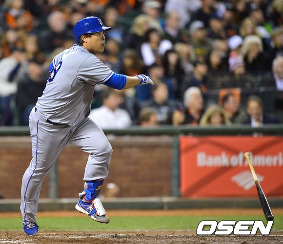 25일 (이하 한국시간) 미국 캘리포니아 샌프란시스코 AT&T 파크에서 열린 2013 메이저리그 샌프란시스코 자이언츠와 LA 다저스 경기 7회초 무사 류현진이 우전 안타를 치고 있다.