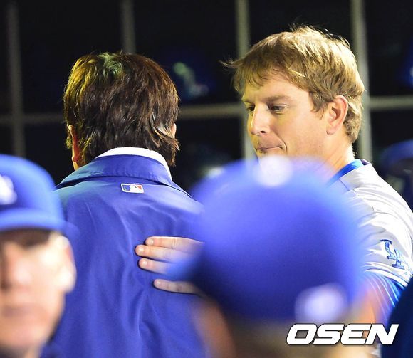 7회말 투구를 마치고 내려온 류현진을 A.J 엘리스가 격려하고 있다./ rumi@osen.co.kr