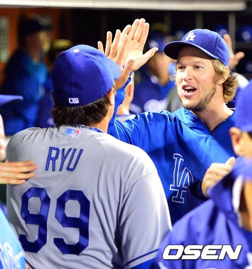 7회말 투구를 마치고 내려온 류현진이 커쇼와 하이파이브를 하고 있다./ rumi@osen.co.kr