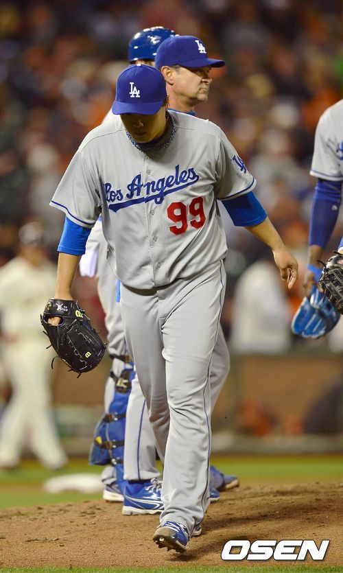 25일 (이하 한국시간) 미국 캘리포니아 샌프란시스코 AT&T 파크에서 열린 2013 메이저리그 샌프란시스코 자이언츠와 LA 다저스 경기에 선발 등판한 류현진이 7이닝 1실점 호투하며 승리투수 요건을 세우고 마운드에서 내려왔다.