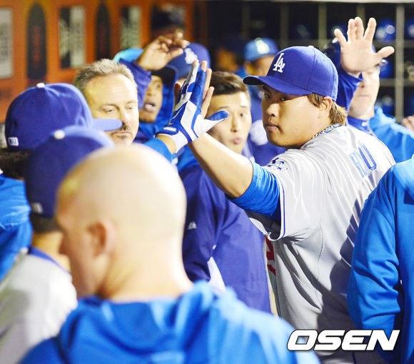 류현진이 7이닝 4피안타(1피홈런) 1볼넷 6탈삼진 1실점으로 막고 덕아웃에서 동료들과 하이파이브를 하고 있다. / rumi@osen.co.kr