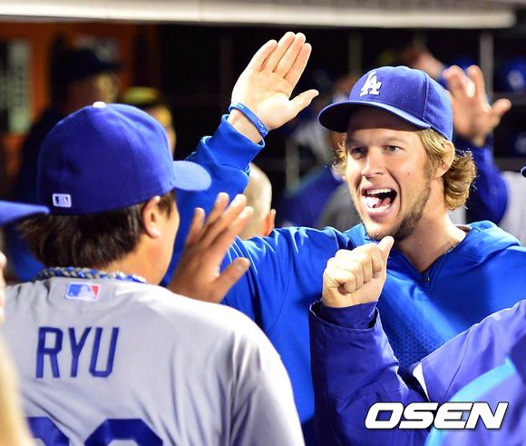 류현진이 커쇼와 하이파이브를 하고 있다. / rumi@osen.co.kr