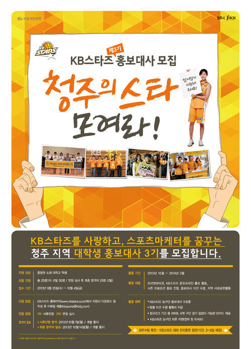 창단 50주년을 맞이한 청주KB스타즈 여자농구단이 WKBL 2013-2014시즌을 앞두고 청주 지역연고 활성화에 기여할 대학생 홍보대사를 모집한다.