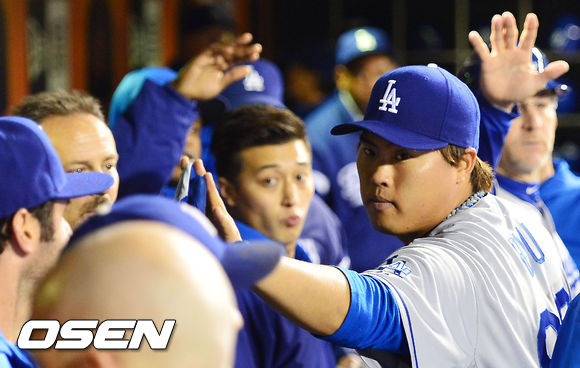 류현진이 덕아웃에서 동료들과 하이파이브를 하고 있다. / rumi@osen.co.kr