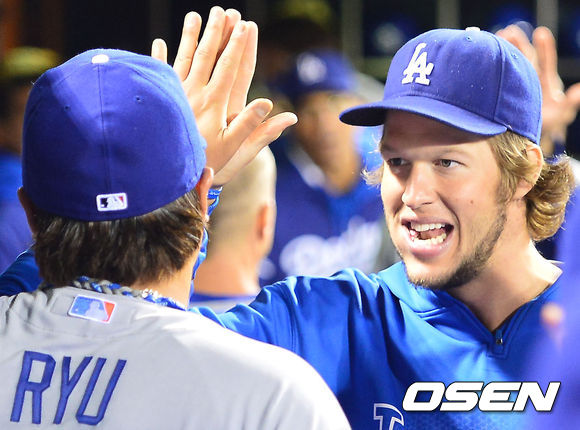 덕아웃에서 클레이튼 커쇼와 류현진이 하이파이브를 하고 있다. / rumi@osen.co.kr