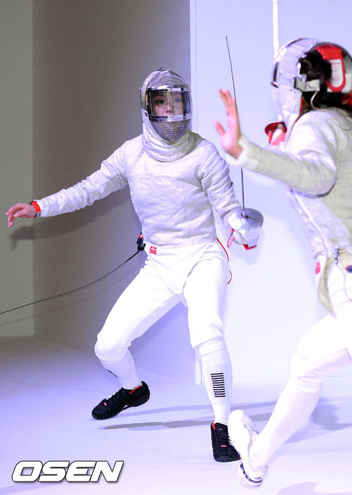 25일 오후 서울 청담 비욘드 뮤지엄에서 열린 '인천아시안게임키퍼 티쏘, 대회 D-1년 카운트다운 돌입'행사에 참석한 2012 런던 올림픽 펜싱 금메달 리스트 김지연이 펜싱 게임 시연을 선보이고 있다.