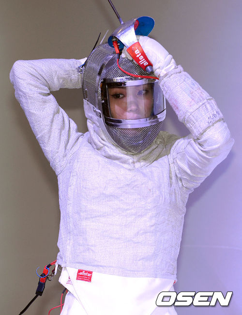 25일 오후 서울 청담 비욘드 뮤지엄에서 열린 '인천아시안게임키퍼 티쏘, 대회 D-1년 카운트다운 돌입'행사에 참석한 2012 런던 올림픽 펜싱 금메달 리스트 김지연이 펜싱 의상을 점검하고 있다.