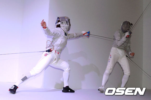 25일 오후 서울 청담 비욘드 뮤지엄에서 열린 '인천아시안게임키퍼 티쏘, 대회 D-1년 카운트다운 돌입'행사에 참석한 2012 런던 올림픽 펜싱 금메달 리스트 김지연이 펜싱 게임 시연을 선보이고 있다.