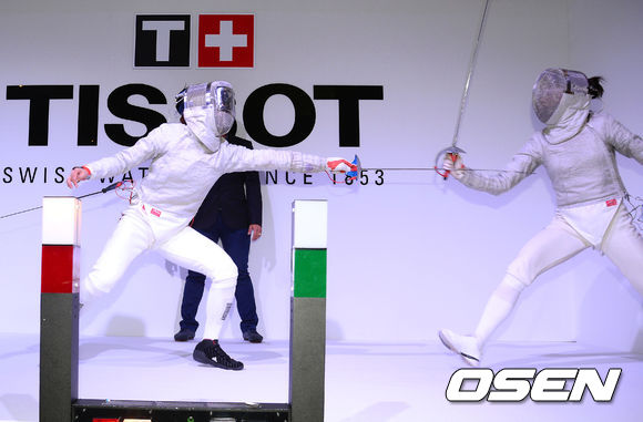 25일 오후 서울 청담 비욘드 뮤지엄에서 열린 '인천아시안게임키퍼 티쏘, 대회 D-1년 카운트다운 돌입'행사에 참석한 2012 런던 올림픽 펜싱 금메달 리스트 김지연이 펜싱 게임 시연을 선보이고 있다.