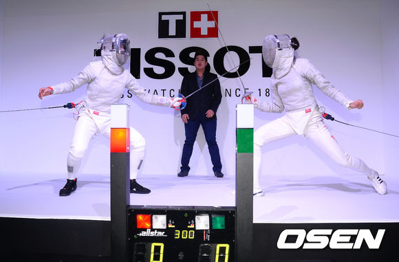 25일 오후 서울 청담 비욘드 뮤지엄에서 열린 '인천아시안게임키퍼 티쏘, 대회 D-1년 카운트다운 돌입'행사에 참석한 2012 런던 올림픽 펜싱 금메달 리스트 김지연이 펜싱 게임 시연을 선보이고 있다.