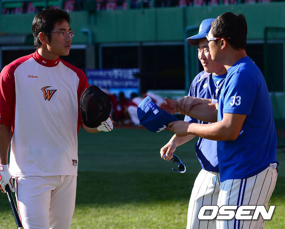 25일 오후 인천 문학구장에서 열리는 '2013 한국야쿠르트 세븐 프로야구' SK 와이번스와 삼성 라이온즈의 경기에 앞서 삼성 최형우가 SK 박정권의 괴롭힘에 박한이에게 일러바치고 있다