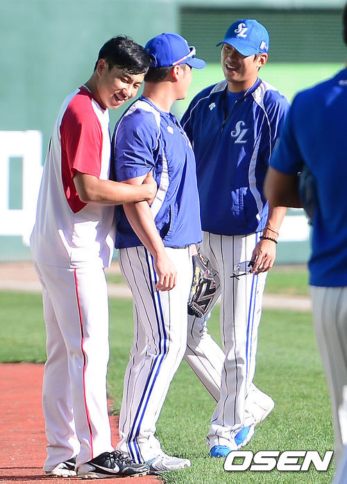25일 오후 인천 문학구장에서 열리는 '2013 한국야쿠르트 세븐 프로야구' SK 와이번스와 삼성 라이온즈의 경기에 앞서 삼성 오승환과 윤성환, SK 김강민이 장난을 치고 있다.