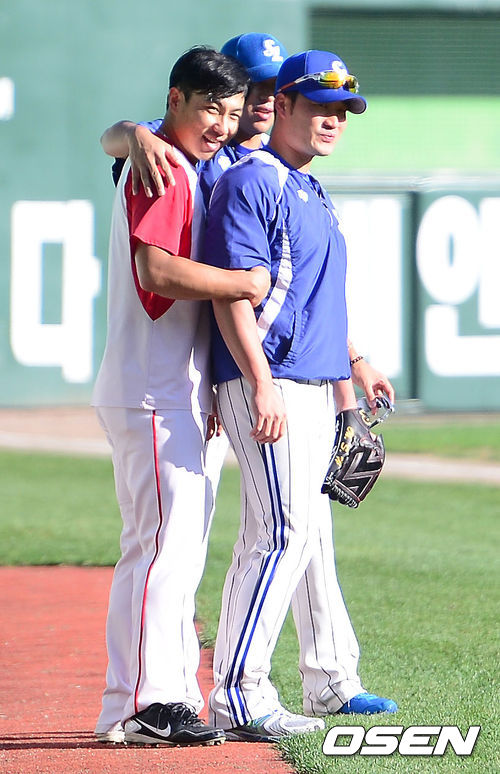 25일 오후 인천 문학구장에서 열리는 '2013 한국야쿠르트 세븐 프로야구' SK 와이번스와 삼성 라이온즈의 경기에 앞서 삼성 오승환과 윤성환, SK 김강민이 장난을 치고 있다.