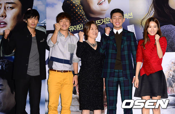 배우 김성오, 이시언, 김해숙, 유아인, 정유미가 포토타임을 하고 있다.
