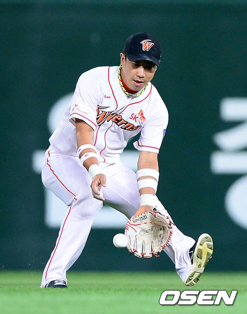 25일 오후 인천 문학구장에서 열린 '2013 한국야쿠르트 세븐 프로야구' SK 와이번스와 삼성 라이온즈의 경기, 1회초 1사 1루 삼성 박석민의 중견수 앞 안타때 SK 김강민 중견수가 타구를 놓치고 있다