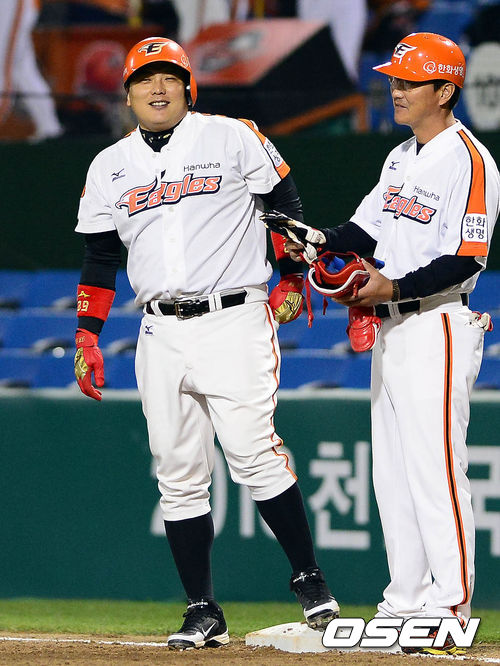 25일 오후 대전구장에서 열린 '2013 한국야쿠르트 세븐 프로야구' 한화 이글스와 LG 트윈스의 경기 2회말 1사 1루 김태균이 중전안타를 치고 1루에서 미소 짓고 있다.